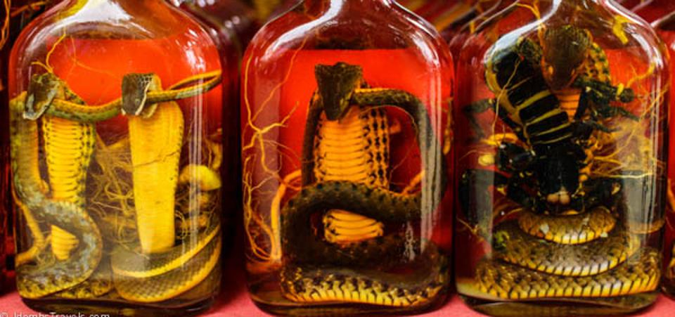 Let’s end this defiling of the whisky industry with a trip to Asia. Specifically, Thailand, and its exotic jungles and diverse wildlife. So, how do you put a unique Thai twist on whisky? Add a snake, of course. Produced by Thailand Unique, this rice-based whiskey has a variety of animals put into the bottles, where it is then aged for a few months prior to sale. What types of animals? Well. a whole bunch of different kinds of snakes, including cobras, king snakes, grass snakes, and vine snakes. But that’s not all. If you’re hankering for something completely different, you can enjoy a dram that contains giant centipedes, Gecko lizards (try putting that in your 15%-off ads), and Thai spiders.